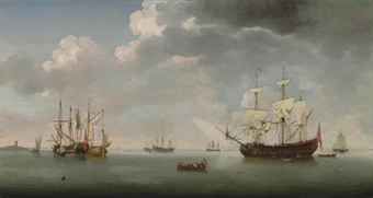 | A 70-gun Royal Naval two decker, a small merchantman, a Dutch galliot and other shipping, on calm waters | |