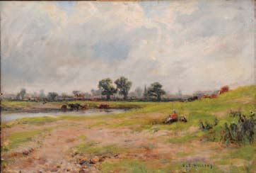| Harvest scene with view to a church spire in the distance; Landscape with figure, dog and cattle, view to a village beyond; Rive | |