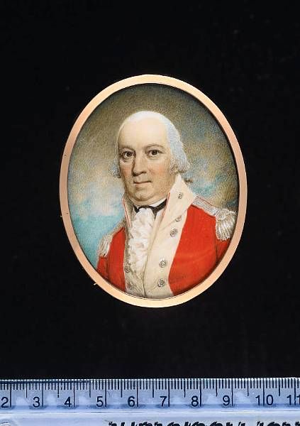 | A Field Officer, wearing scarlet coatee with white facings, silver buttons matching epaulettes, white waistcoat frilled chemise | |