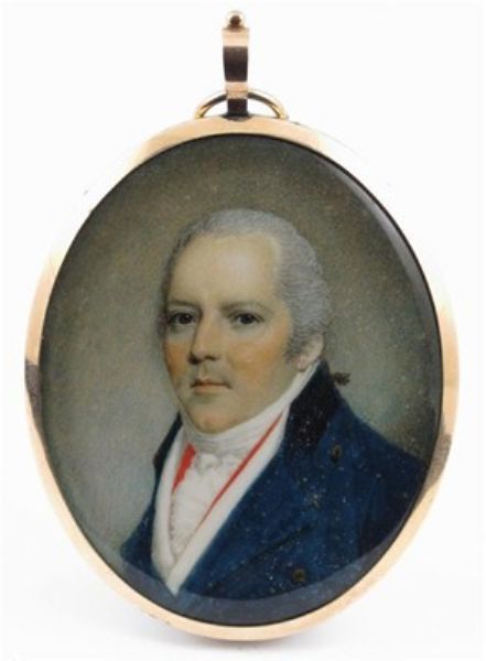 A gentleman, head and shoulders, facing left, wearing a blue coat