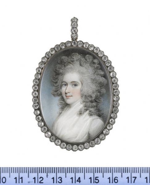 | A Lady, wearing white dress and fichu, her powdered wig worn in the à la conseilleur style. | |