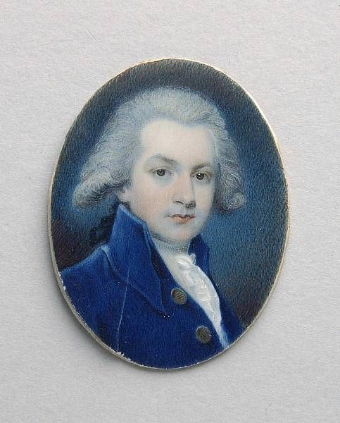 | A young gentleman, his powdered hair tied with a ribbon, and wearing a royal blue coat with yellow waistcoat and white frilled s | |