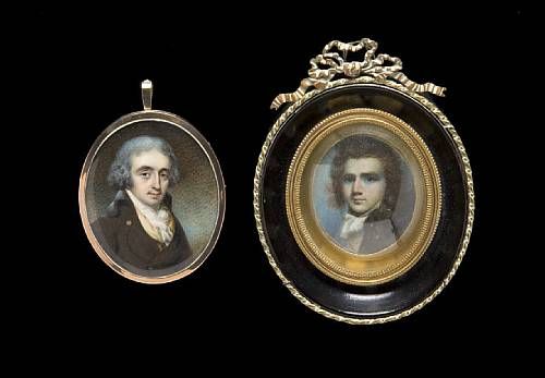 Two portraits of Gentlemen, wearing brown coats, yellow waistcoats and tied white stocks