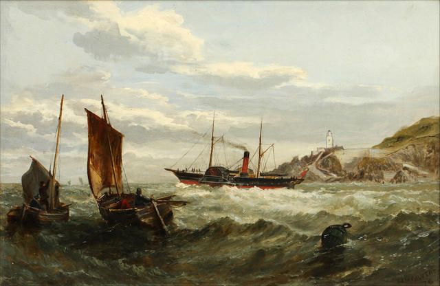 Steam boat and other shipping off a rocky coast; and companion