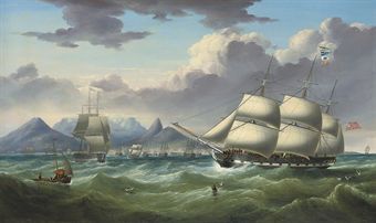 | The merchantman Duke of Lancaster flying her recognition flags as she arrives in Table Bay, Cape Town, with another merchantman | |