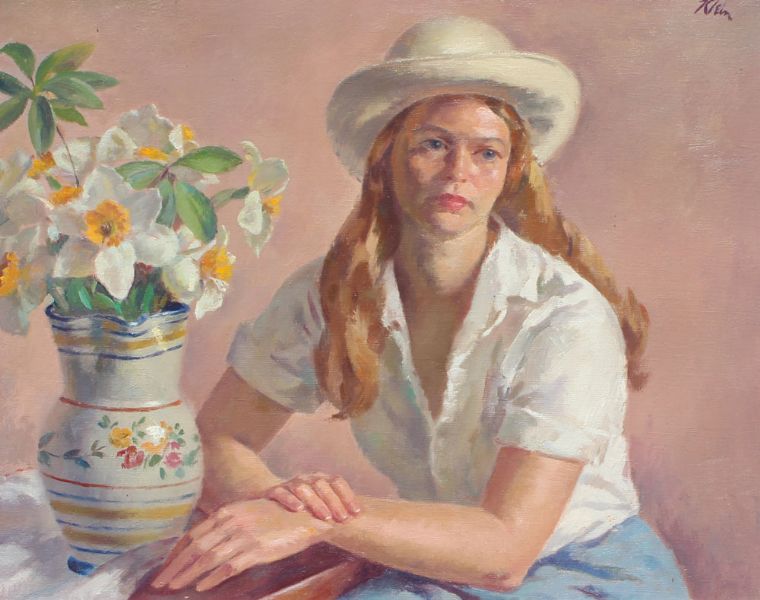 Portrait of a Young Girl Posing with Flowers in a Vase