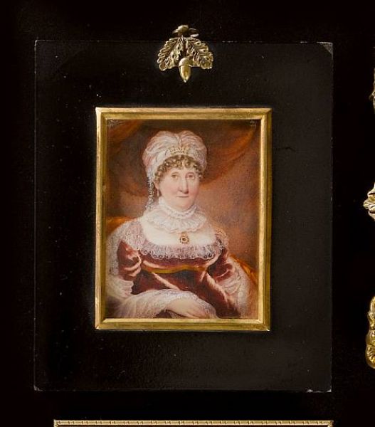 | A Lady, wearing crimson dress with gold ribbon waistband and white lace collar, lace-trimmed white shawl, ruff, turban dressed w | |