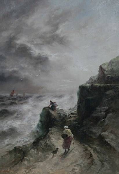 A stormy coastal scene, figures on a coastal path looking out to sea towards fishing boats