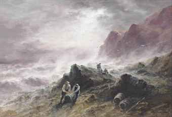 Salvagers hauling barrels onto the rocks, Jersey