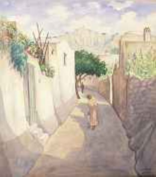 Eine Frau mit zwei Kleinkindern in einer südlichen Dorfstrasse