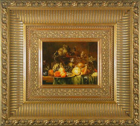 | Prächtiges Stilleben im Stil des 17.Jhdts. mit gläsernen Prunkgefäßen, Früchten und Zinnteller auf einem Tisch mit schweren Stof | |