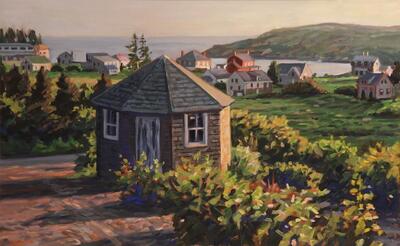 "Octagon, Monhegan", oil on canvas, signed lower left "Moore", titled verso and dated 1998, depicting a small building on the Maine landmark island, in gold molded frame with linen liner, OS: 39" x 57", SS: 29 1/2" x 47 1/2". Fine condition. From the | |