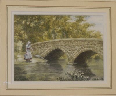 River scene with cobbled bridge and girl on the bank holding a bucket