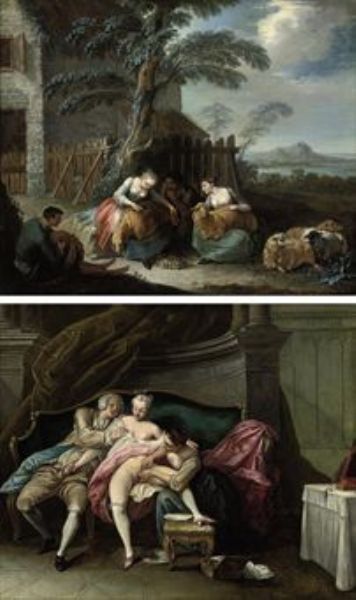 | Shepherds shearing sheep in a landscape (recto); and A lady with her lover in her boudoir, being attended to by her maid (verso) | |