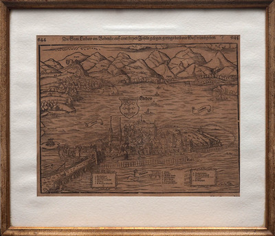 Mit den umgebenden Bergen. Oben bez. "Die Statt Lindaw, auff einer freyen Inseln am Bodensee gelegen"
