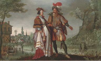 | A wooded landscape with an elegant couple courting, a town beyond | |