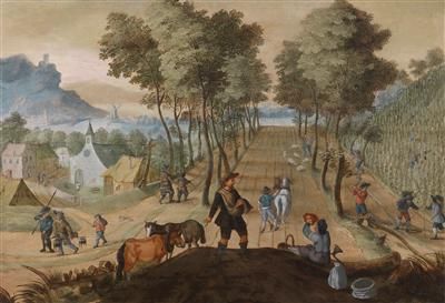 | Tree-filled landscape near a village with peasants at work in the fields | |