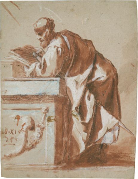 | Brush brown ink, reddish brown, heightened with white, the sudy of a kneeling clergyman in black chalk | |