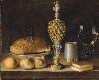 | A giant roemer of wine, a gold beaker, a lemon, two rolls, books and a pie on a pewter plate on a stone ledge | |