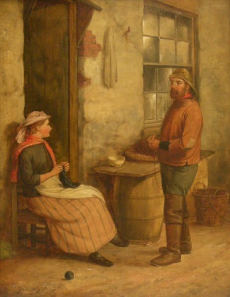 | Scarborugh fishergirl knitting with fisherman preparing line | |