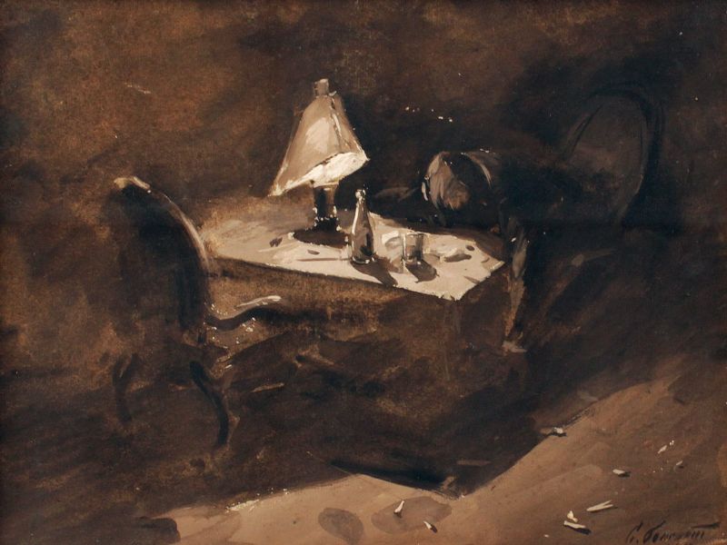 Interior Brown Study w/Figure Passed out at a Desk