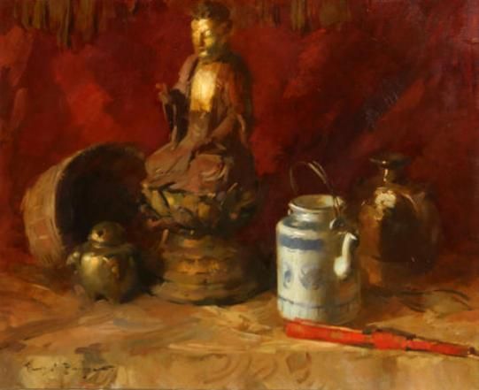 Still life with Buddha, teapot and fan