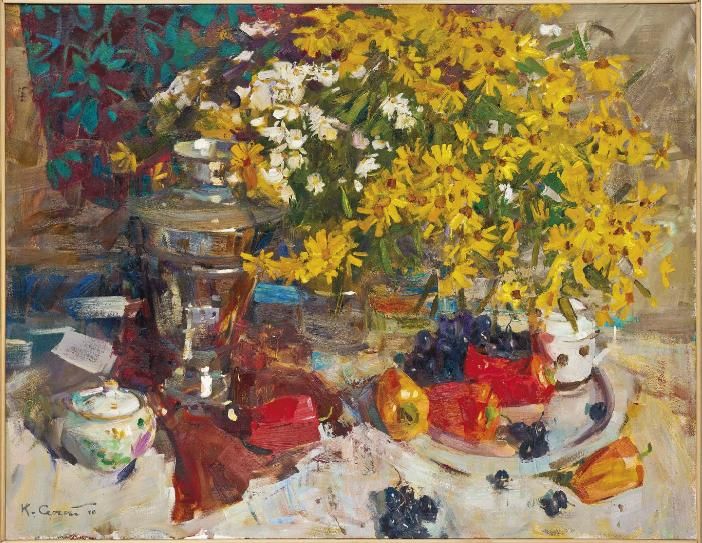 | Daisies in a glass vase, a samovar, a sugar bowl, red and yellow peppers and black grapes on a table | |