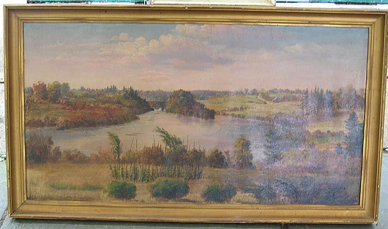Landscape with lake and bridge in distance
