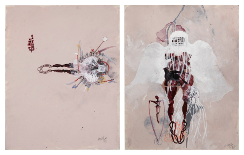 | Gouache watercolor, acrylic, pencil and clay on paper; Vegetable dye, watercolor, acrylic, gouache, pencil and clay on paper | |