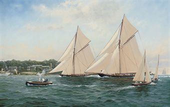 | The King's cutter Britannia and the mighty Satanita powering to the finish off the Royal Yacht Squadron, 1893 | |