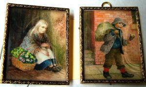 A young girl seated with a basket of flowers and a young boy standing with a sack and ringing a bell