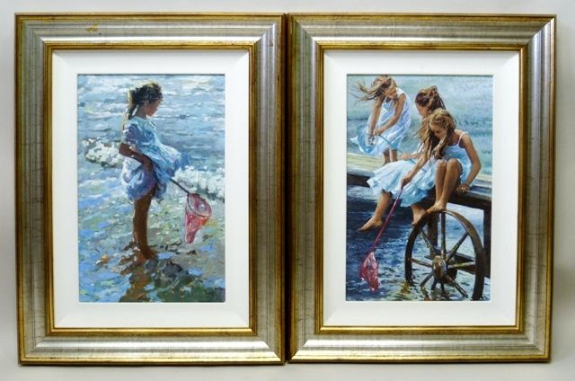 Cherished Times 1 and 2, Young Girls with Fishing Nets at the Waters edge