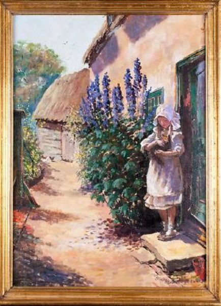 ' Summers Day ' A Young Girl with Kitten Standing by a Cottage Door