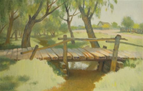 Landscape with wooden bridge over stream