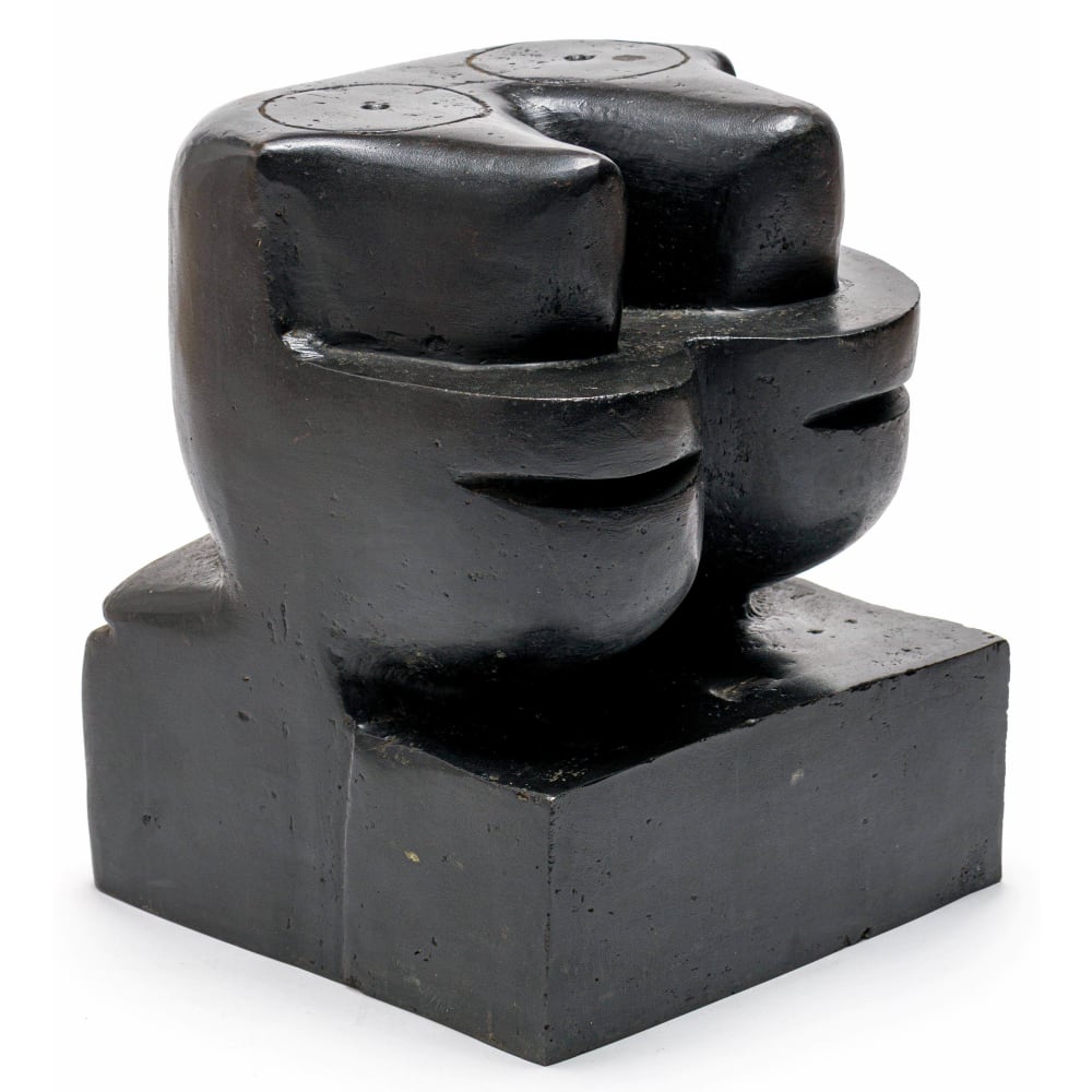 Bronze with a black patina on a wooden base
