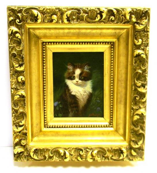 | portrait of white and gray tuxedo kitten sitting among long grasses and violets | |