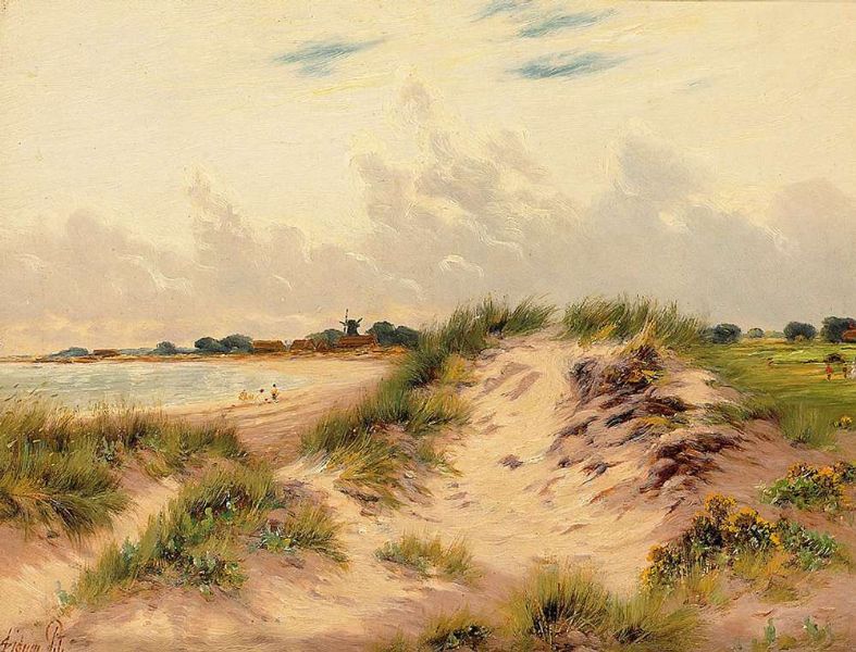 Sommerliche Küsten-/Dünenlandschaft mit ferner Mühle