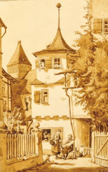 Kleinstadtszene: Ein Schuster repariert vor dem Haus Schuhe