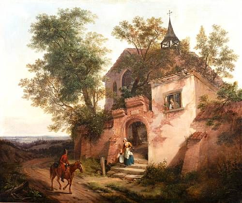 | A mother and child at the gate of a country church, with a traveller on a horse on the road. | |