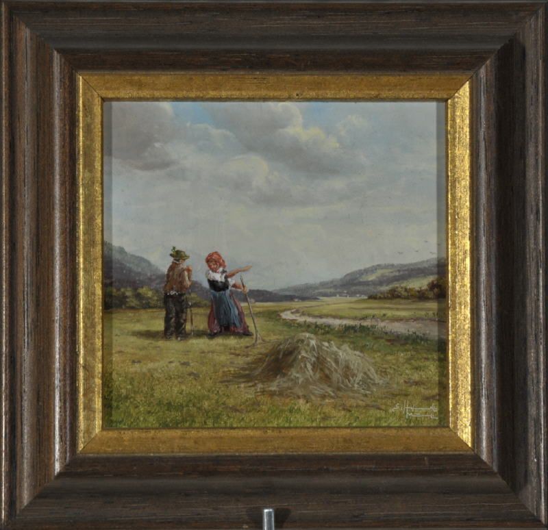 Pärchen bei der Heuernte in einer Allgäuer Landschaft