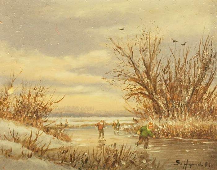 Winterlandschaft bei Abenddämmerung mit Schlittschuhläufern