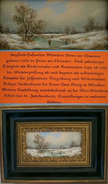 Winterlandschaft mit Schlittschuhläufern und Spaziergängern und im Hintergrund der Blick auf München