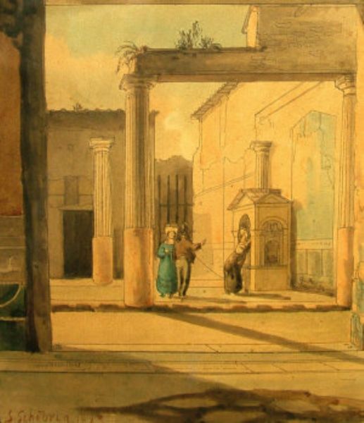 Figures gathered at a well in an Italianate courtyard scene