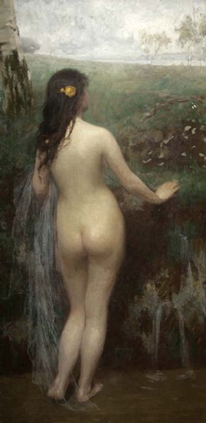 Stehender weiblicher Rückenakt mit Schleier in Landschaft