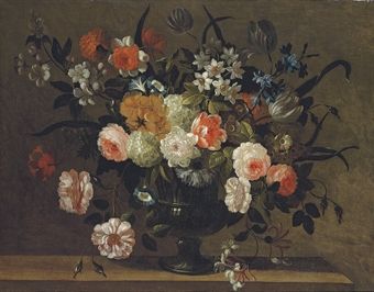 | Roses, carnations, morning glory, bluebells, honeysuckle and other flowers in a classical urn on a stone ledge | |