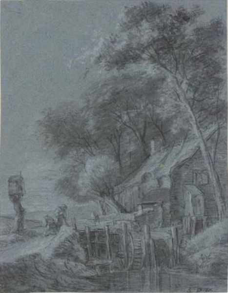 | A mill on a wooded riverbank, with two labouring peasants | |