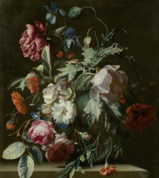 | Roses, poppies, irises and other flowers in a vase on a stone slab. | |