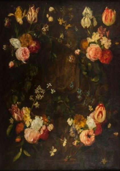Bouquets de fleurs sur un encadrement de pierre sculpté