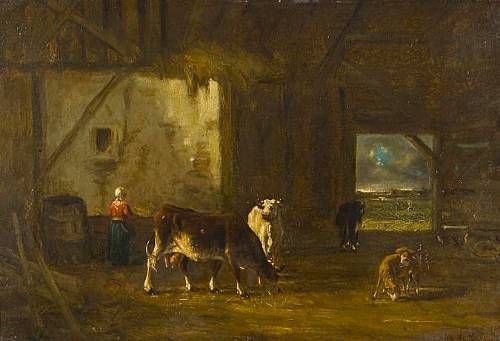 Barn interior with cows, sheep, chickens and maid