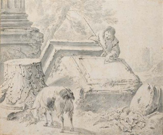 | Berger déchiffrant des inscriptions sur des ruines antiques, une chèvre au premier plan | |